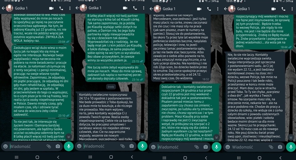 W swoich wiadomościach moja była żona, właściwie bez względu na temat nazwijmy to rozmowy, nawiązuje do kwestii łożenia na córkę i zarzuca mi zaniedbania w tym względzie. Gdyby wiadomości te przeczytał ktoś kto nie zna sprawy, wyszłoby mocno nie fajnie. Po co to robi? Może właśnie dlatego. Celowo ex pomija fakt, że bezpośrednio po rozstaniu gdy ja mimo braku wyroku sądu przesyłałem jej pieniądze na Klaudie (regularnie, co miesiąc) a w zamian słyszałem: (cytuję) dostaniesz córkę dopiero jak zdecyduje sąd (czyli po postanowieniu). O całej reszcie hipokryzji nie będę dziś już pisał... jest to jeden z postów w którym ukryję, nie napiszę wszystkiego co czuję i w związku z czym chciałbym napisać bo wiem, że czytasz... nie dam ci tej satysfakcji choć wiem, że ty wiesz - ile to co robisz tuż przed świętami mnie kosztuje ("Kto ma wiedzieć to wie").